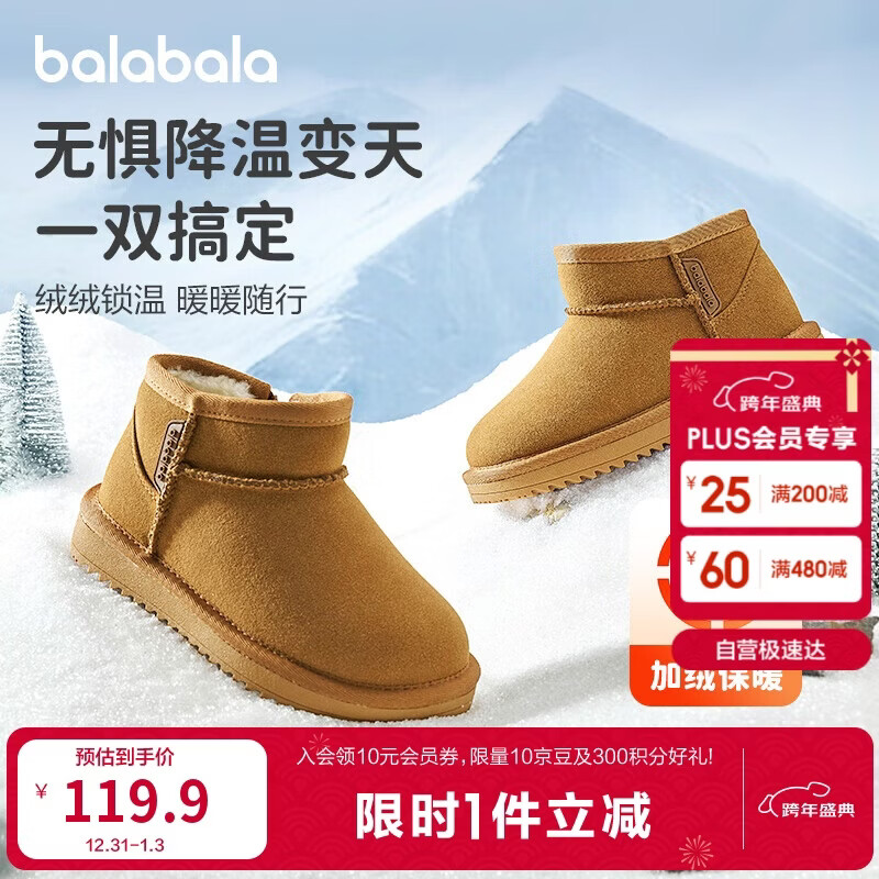 巴拉巴拉儿童雪地靴男童女童短靴加绒加厚棉靴2024新冬季靴子208424141213