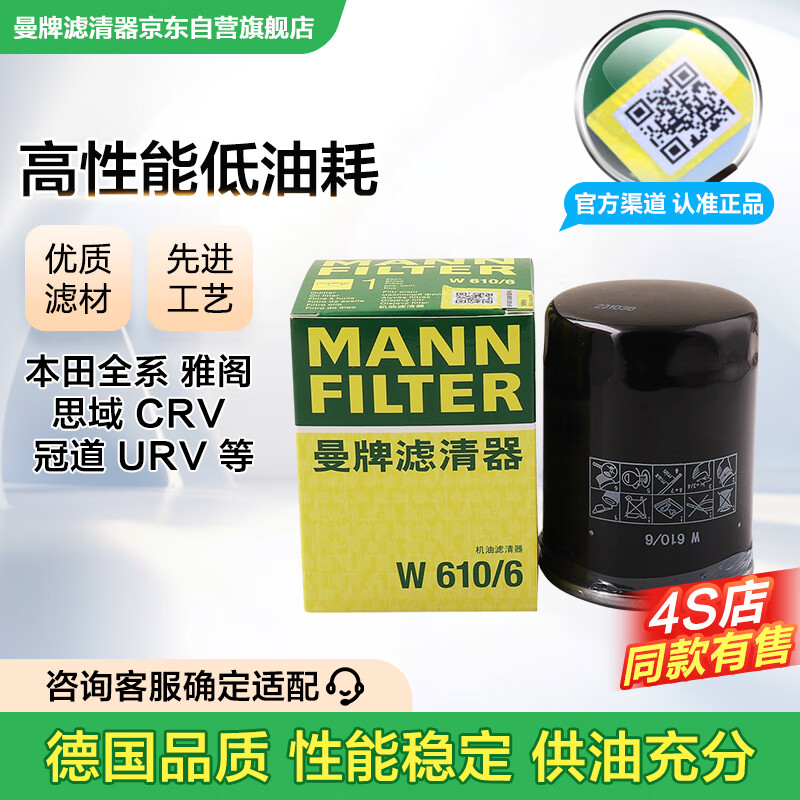 曼牌(MANNFILTER)机油滤清器机油滤芯W610/6思域雅阁英仕派缤智飞度CRV思铂睿冠道