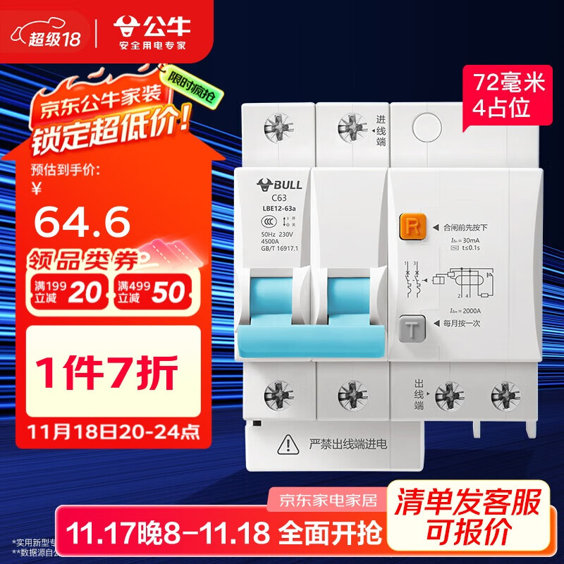 公牛(BULL)空气开关 2P漏电保护断路器 双进双出63A带漏保LBE3-63E/63A-2P