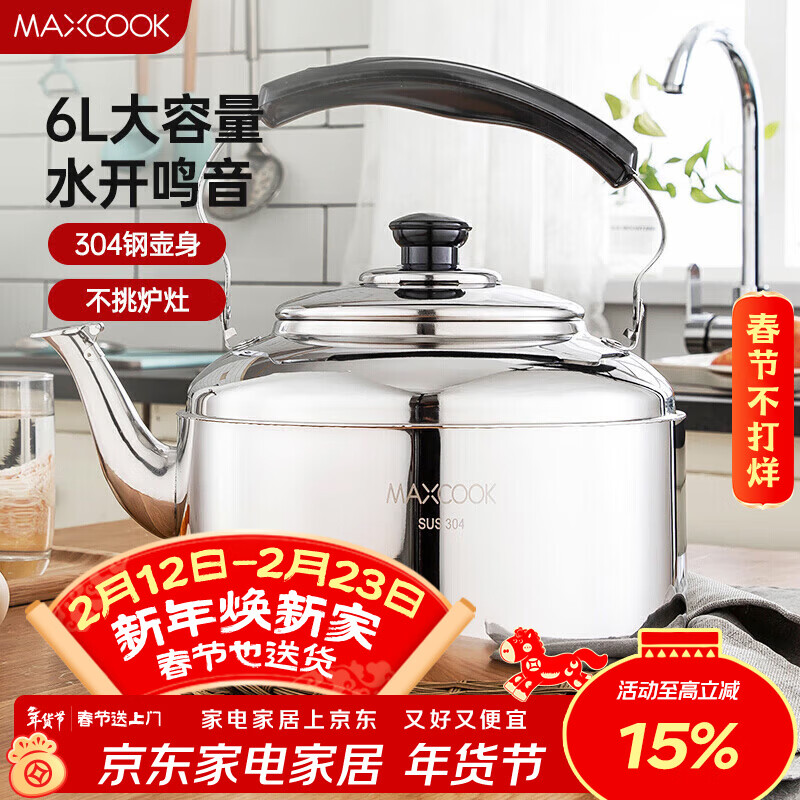 美厨(MAXCOOK)304不锈钢烧水壶 6L加厚中式鸣音 煤气电磁炉通用 MCH654