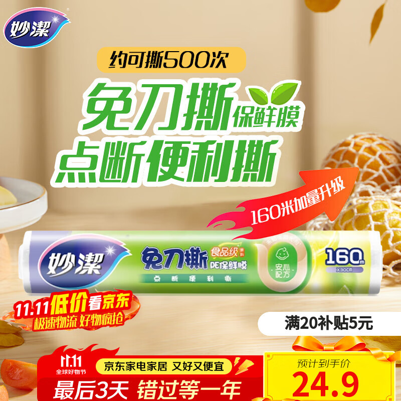 妙洁 免刀撕点断式保鲜膜 经济装大碗*160米 食品级大卷冰箱微波炉用