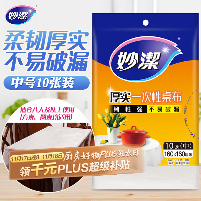 妙洁 一次性桌布厚实台布10张装餐桌塑料膜餐垫野餐布中号颜色随机