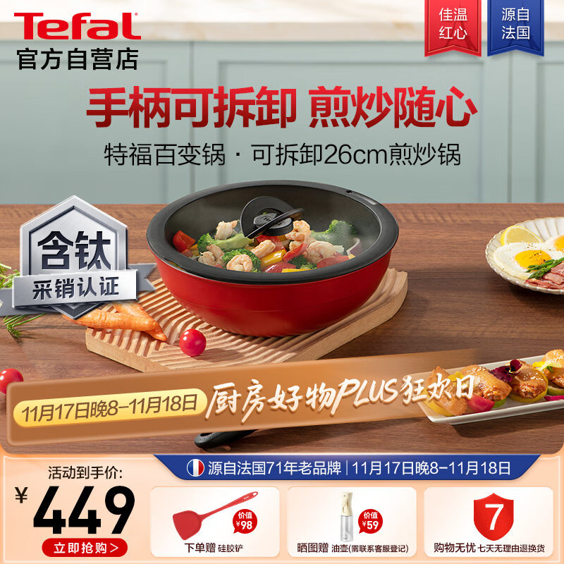 特福(Tefal)可拆卸炒锅26cm煎锅可变烤盘餐具电磁炉烤箱燃气灶通用有钛不粘锅