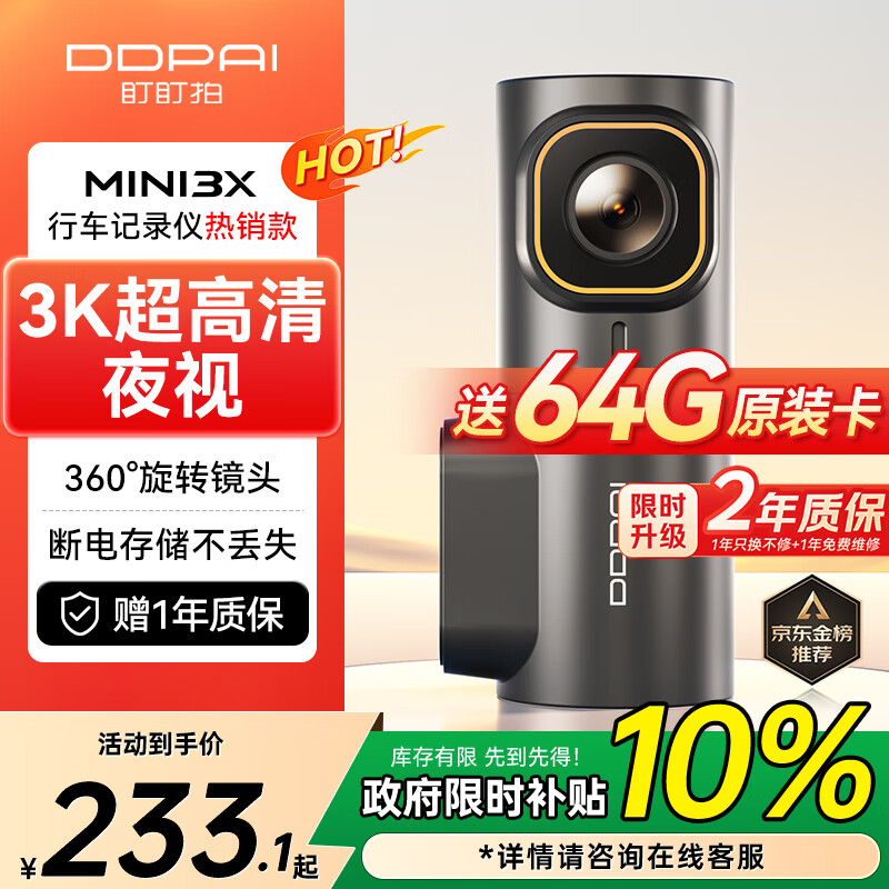盯盯拍行车记录仪MINI3X 3K超清夜视 AOV缩时录影 F1.55光圈 AI驾驶辅助