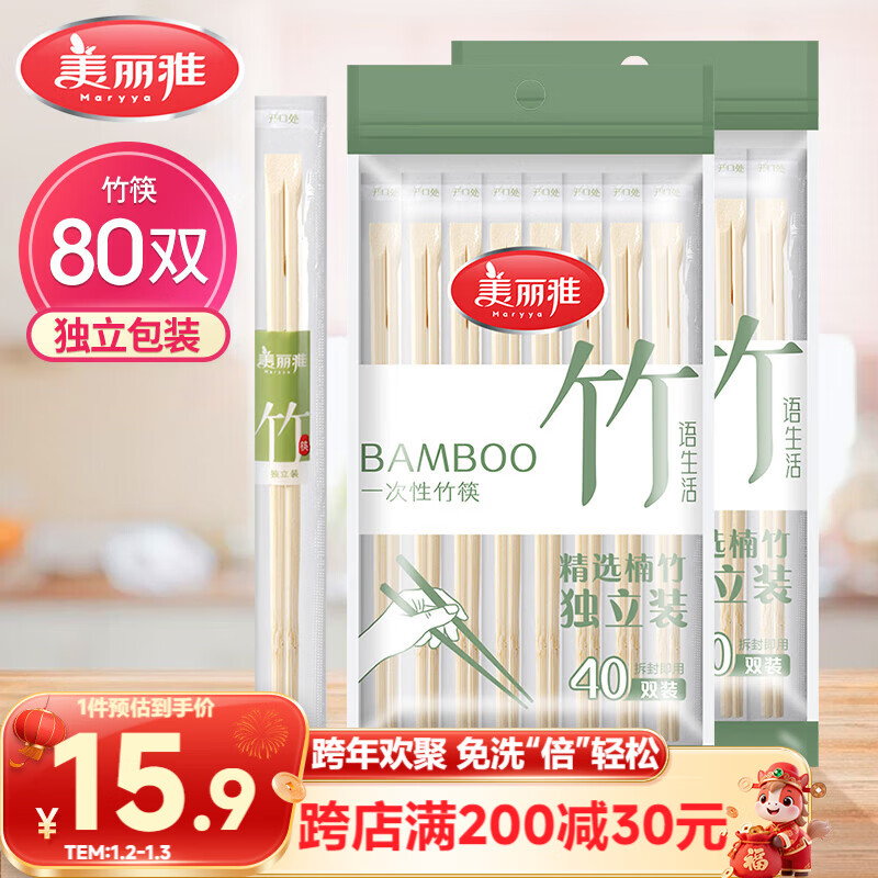 美丽雅 一次性筷子80双 独立包装竹筷子家用外卖打包餐具野餐方便露营