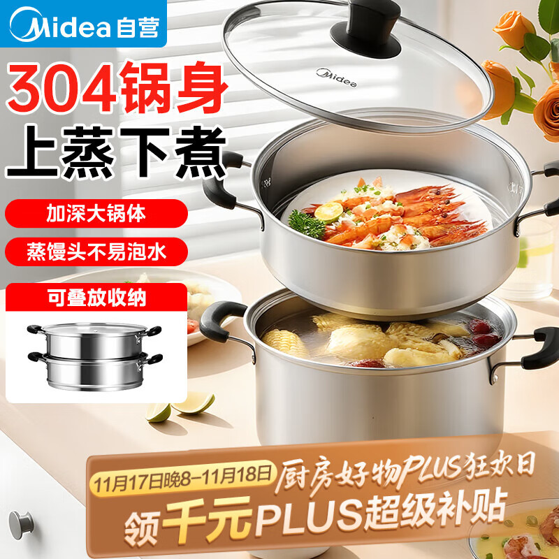 美的(Midea)蒸锅304不锈钢蒸煮两用汤锅馒头包子家用蒸笼锅蒸大闸蟹螃蟹