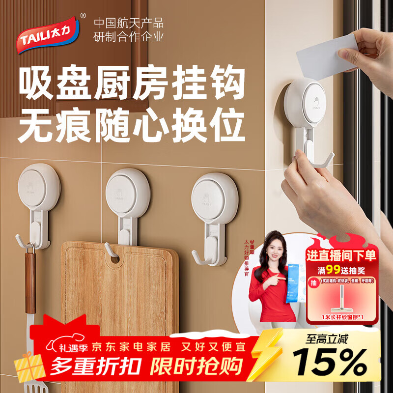 太力吸盘挂钩免打孔强力粘钩厨房置物架无痕真空挂钩超强粘力4件装