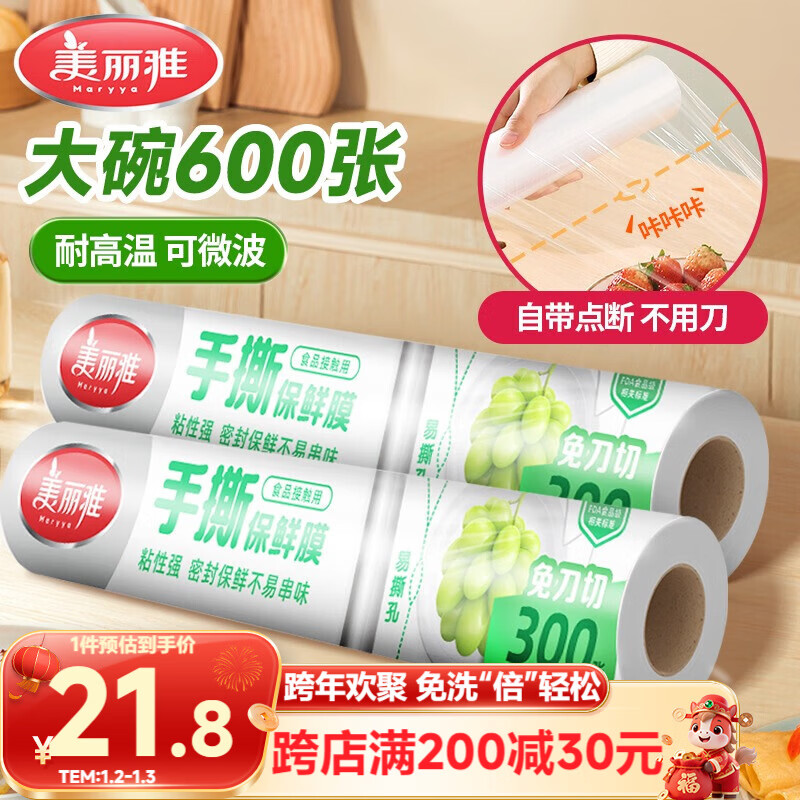 美丽雅 一次性保鲜膜断点式180米*30cm食品级PE 耐高温微波炉适合家用