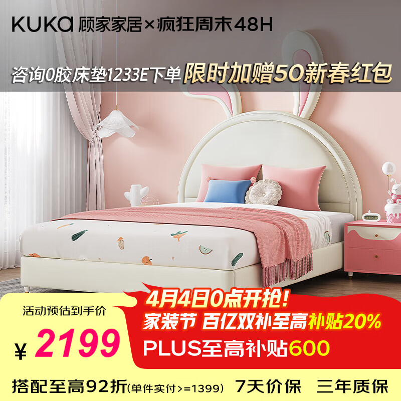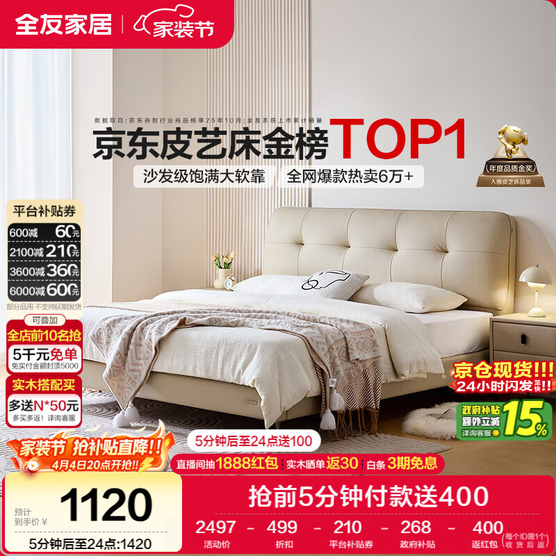 全友家居 奶油风头层牛皮茉伊真皮床头软包靠背卧室家用1.8米双人大床