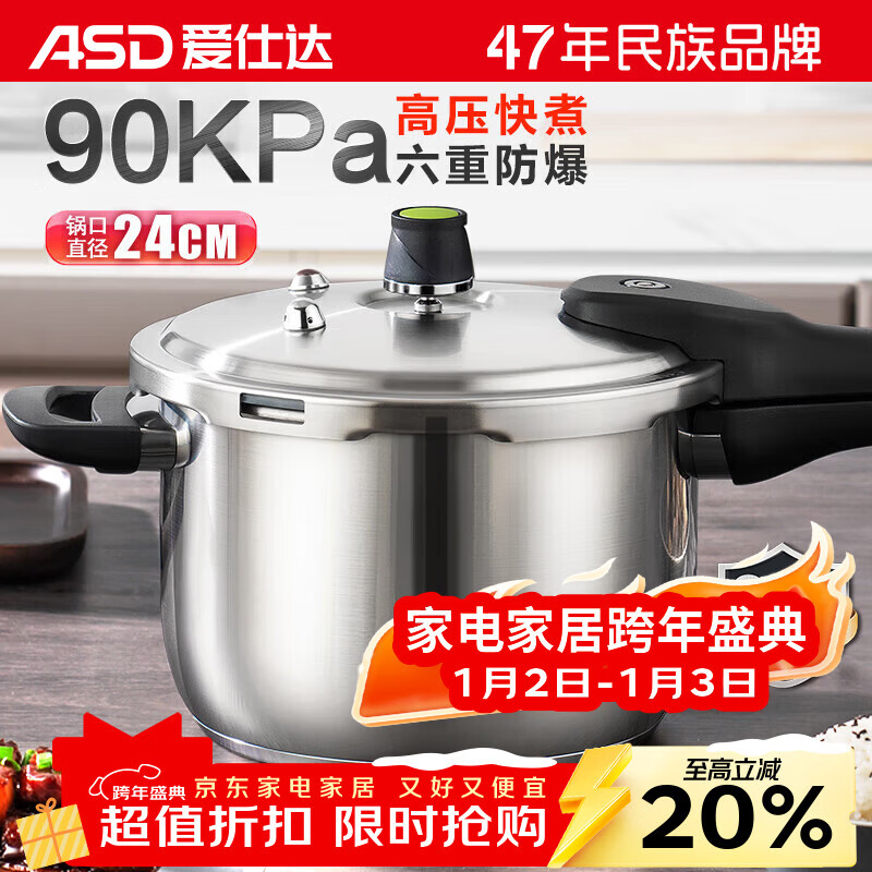爱仕达ASD 高压锅304不锈钢六保险6.5L压力锅燃气电磁通用WG1824DN