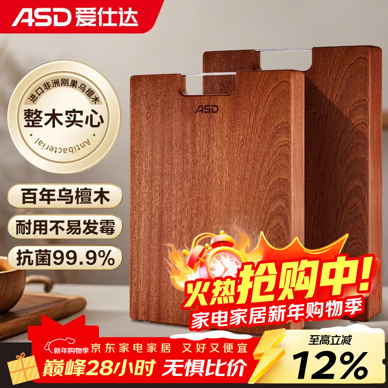 爱仕达(ASD)菜板进口乌檀木99%抗菌砧板整木加大加厚双面防霉面板40*28*2.5cm
