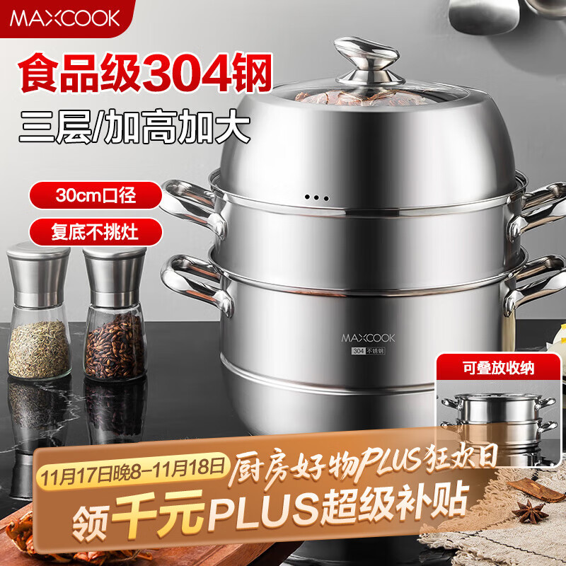 美厨(maxcook)蒸锅 304不锈钢30CM三层蒸锅 加厚复底汤锅 燃气电磁炉通用