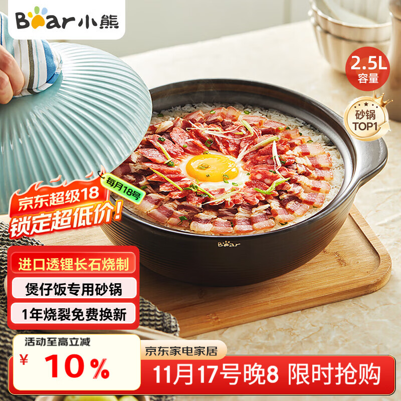 小熊(Bear)砂锅 宽口煲仔饭炖锅耐高温不开裂2.5L煲汤鸡公煲陶瓷锅G0054-S02
