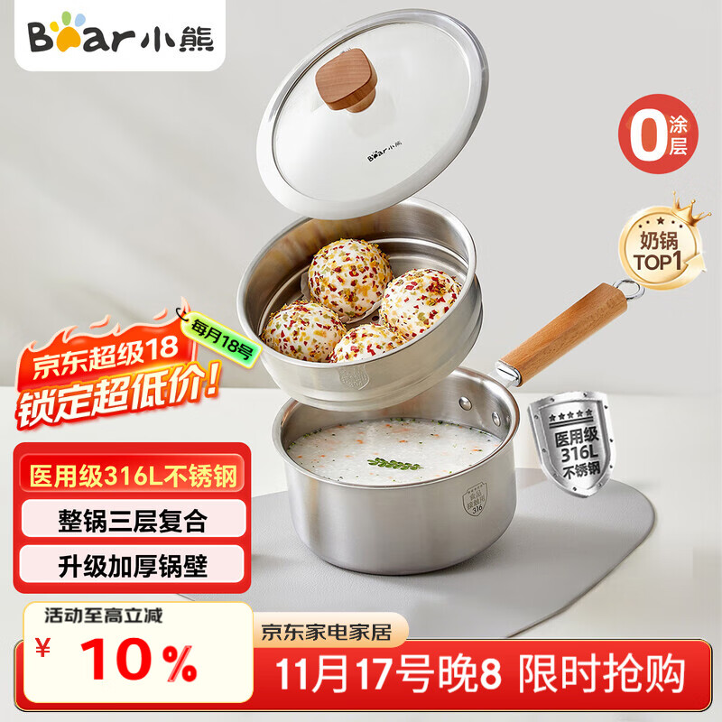 小熊(Bear)奶锅 316L不锈钢婴儿宝宝辅食锅小奶锅加厚汤锅煮面锅带蒸笼18cm