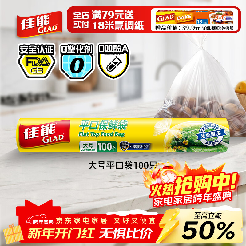 佳能(Glad)食品级保鲜袋大号100个 平口点断式 耐高温生鲜蔬果保鲜RP25