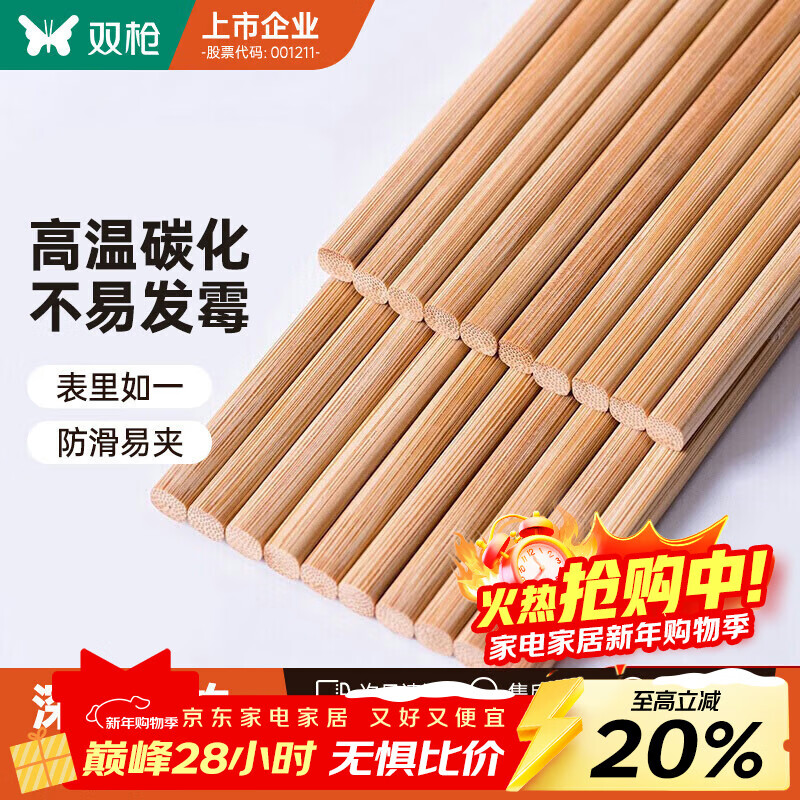 双枪 (Suncha) 天然竹筷子无漆无蜡原竹家用筷子餐具套装 10双装