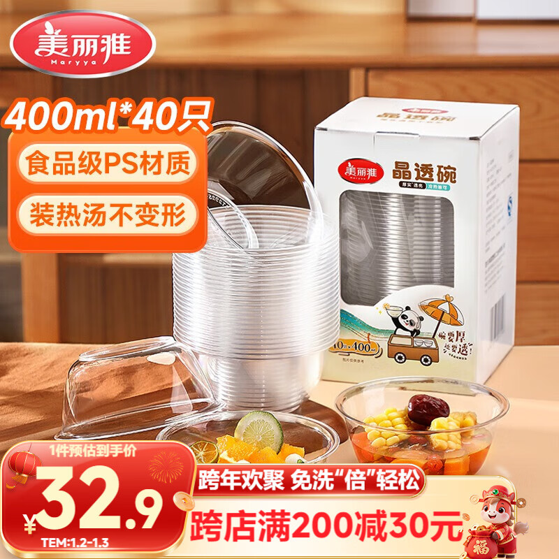 美丽雅一次性碗食品级400ml*40只 耐高温航空水晶碗野餐塑料方便汤碗
