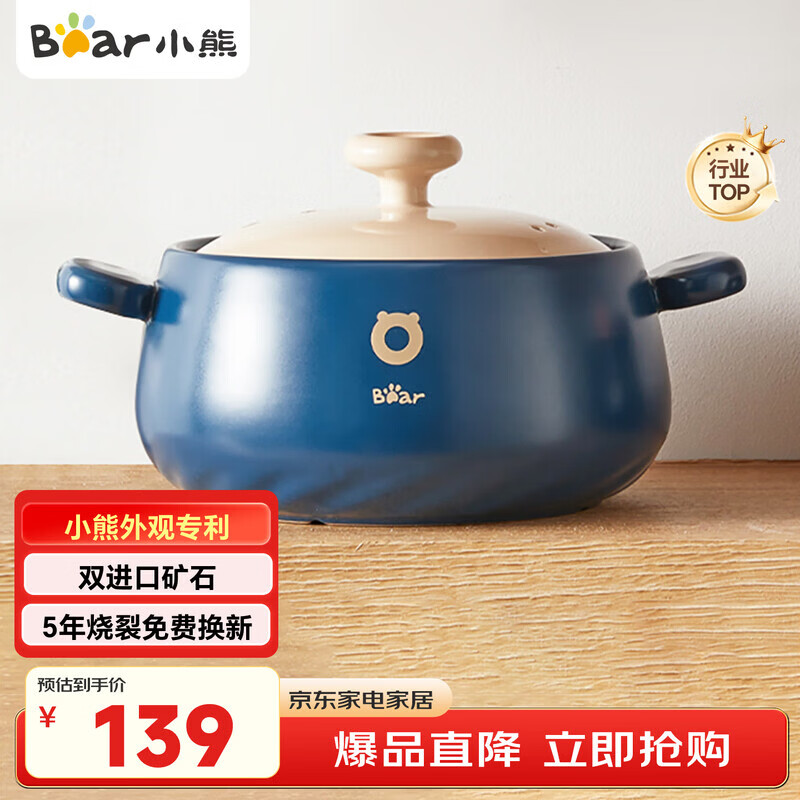 小熊(Bear)砂锅 煲汤锅耐高温不开裂 3.5L通用沙锅 宽口炖锅陶瓷锅G0026-P02
