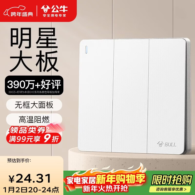 公牛(BULL)开关插座 G12系列 三位双控开关86型暗装大面板G12K312 暮雪白