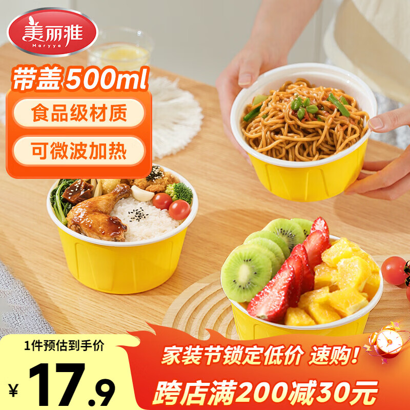 美丽雅一次性饭盒餐盒圆形带盖500ml*30套食品级野餐外卖水果打包盒汤碗