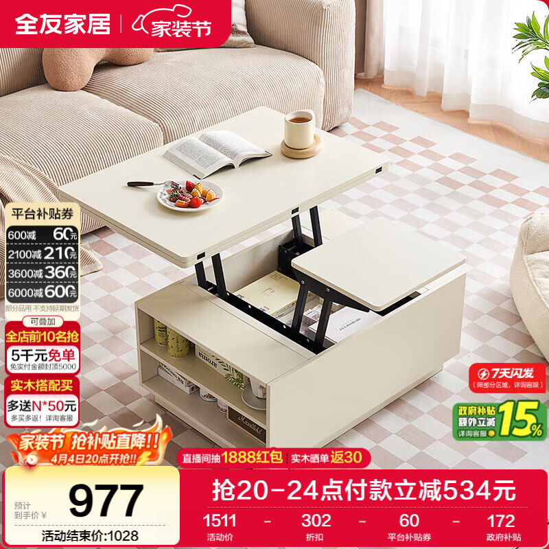 全友家居 新款多功能升降茶几客厅折叠桌小户型奶油风储物收纳柜子