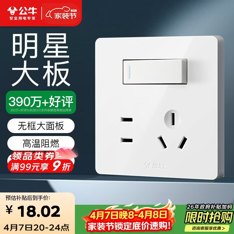 公牛(BULL)开关插座 G12系列一开双控五孔带开关插座86型面板G12E334S象牙白