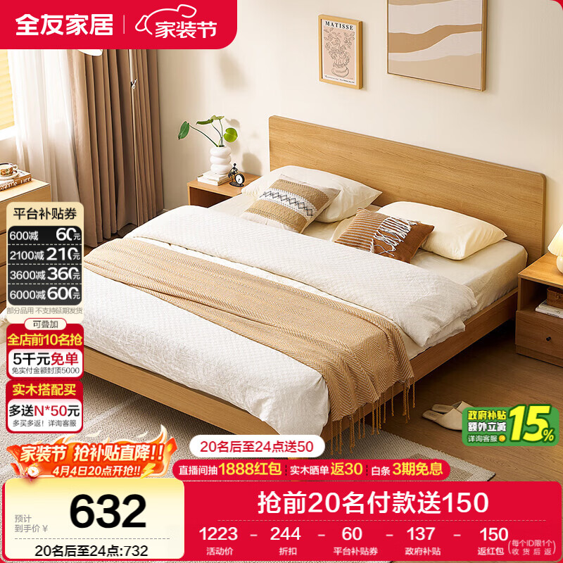 全友家居 床1.5米x2米主卧室双人大床北欧原木极简风出租屋硬板式床
