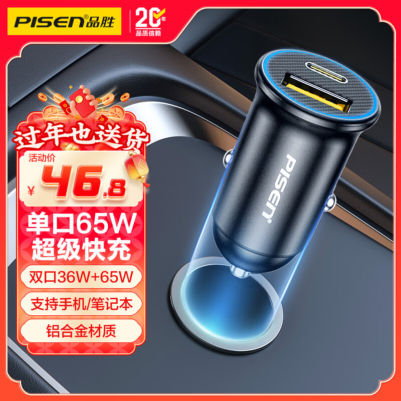 品胜车载充电器65W一拖二车充超级快充汽车充电头转换器适用华为苹果