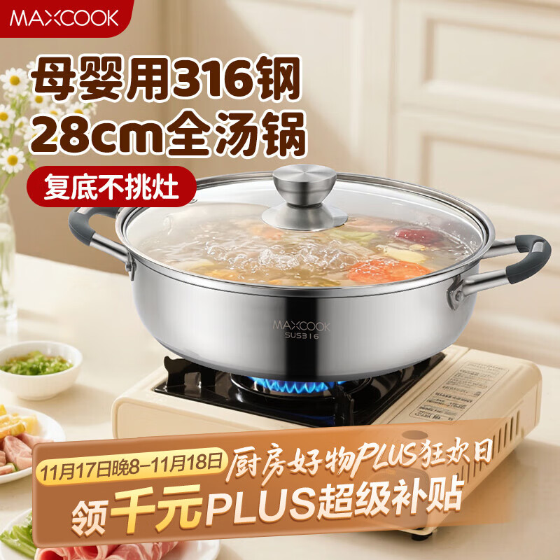 美厨(maxcook)316不锈钢火锅28cm 汤锅火锅复底带盖 燃气电磁炉通用 MCT1969
