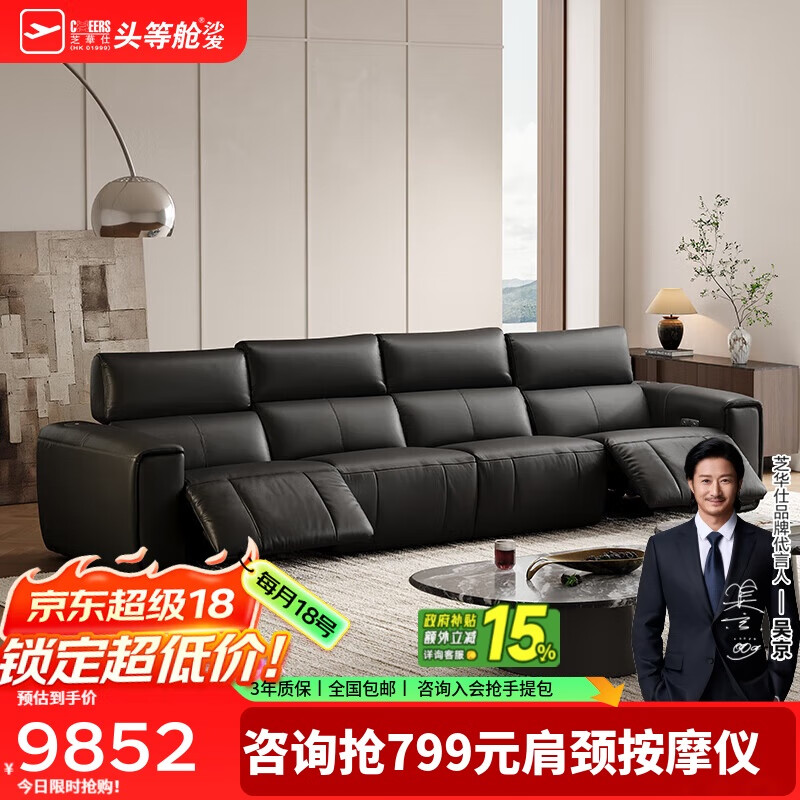 芝华仕(CHEERS)头等舱贵族零靠墙大黑牛真皮电动沙发半青皮芝华士30682黑3.26m