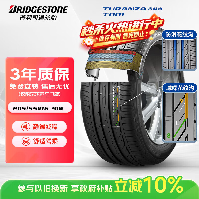 普利司通(Bridgestone)汽车轮胎 205/55R16 91W T001 适配大众朗逸/宝来/丰田卡罗拉