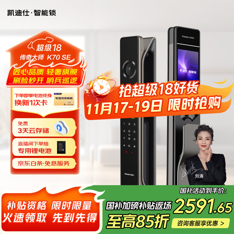 凯迪仕(kaadas)智能门锁 可视猫眼监控 大屏人脸指纹锁智能锁 传奇大师K70 SE