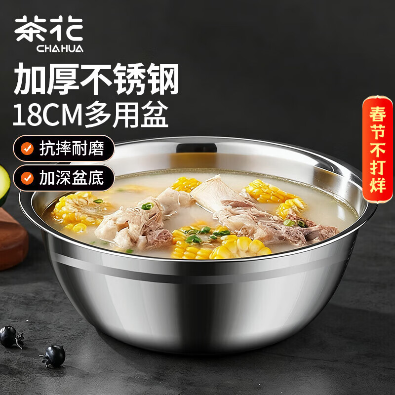 茶花(CHAHUA)甄享不锈钢盆加厚平底汤盆厨房打蛋和面盆洗菜烘焙盆子18厘米