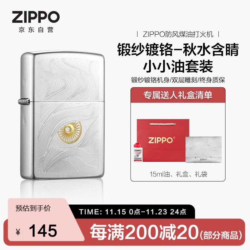 ZIPPO打火机之宝防风煤油 锻纱镀铬-秋水含睛 生日礼物男士 含油套装