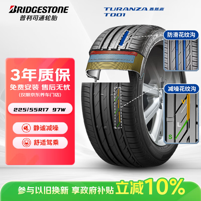 普利司通(Bridgestone)汽车轮胎 225/55R17 97W T001 适配君威/君越/迈锐宝/宝马5系/A6L