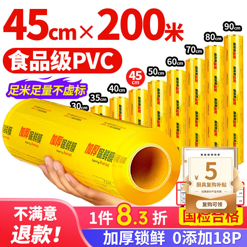 优奥保鲜膜超大卷200M*45CM食品级PVC商用生鲜超市酒店大号缠绕打包膜