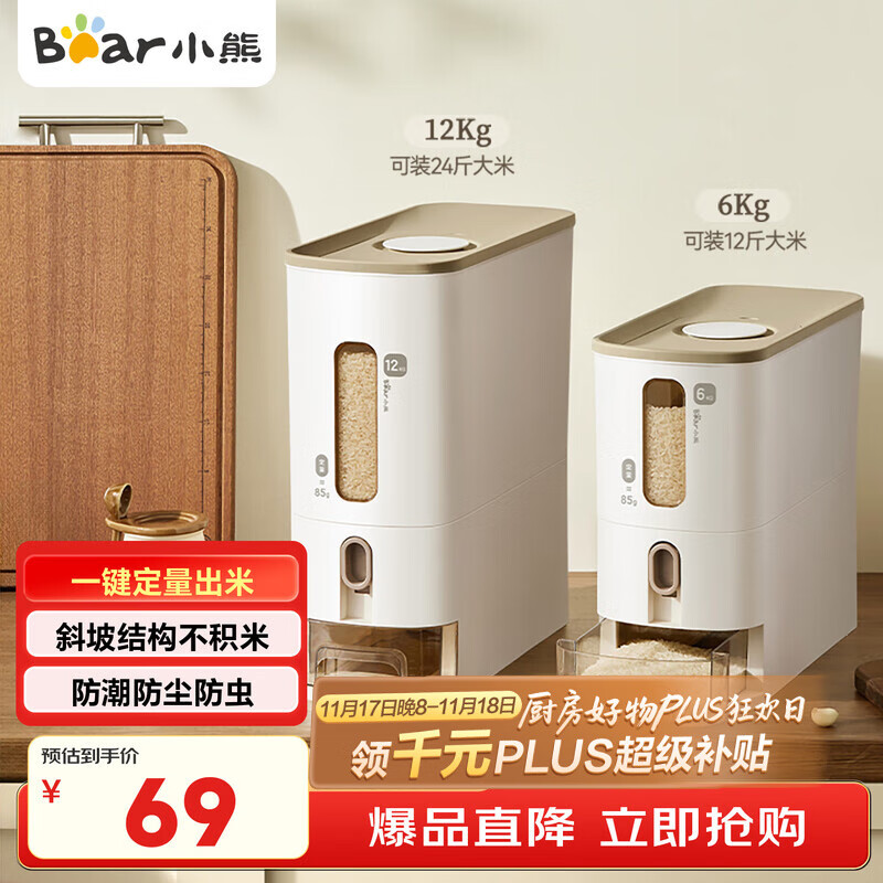小熊(Bear)米桶防虫储米箱 防潮米缸家用食品级面桶 定量自动出米 食品级6KG