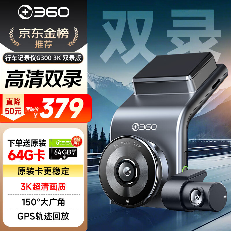360行车记录仪G300 3K双录版 前后高清双摄 F1.5大光圈行车护航