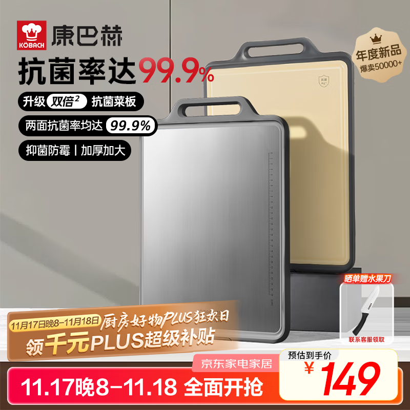 康巴赫(KBH)新款双面抗菌菜板 不锈钢砧板加厚案板不易发霉家用切菜板擀面板
