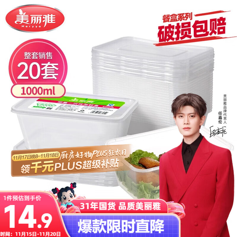美丽雅 一次性饭盒方形1000ml*20套 外卖打包野餐盒加厚带盖塑料可微波