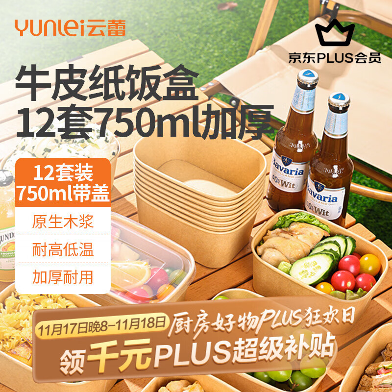 云蕾一次性饭盒纸碗餐盒带盖餐具打包野餐加厚便当饭碗露营750ml*12套