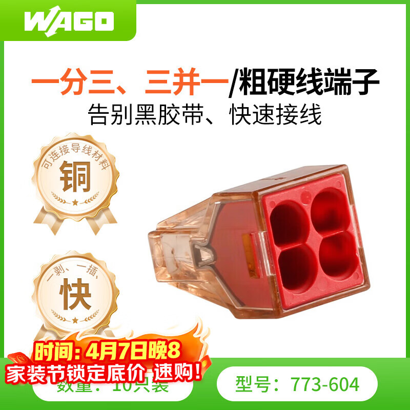 WAGO万可接线端子 插拔式绝缘端子 四孔硬线电线连接器 10只装773-604