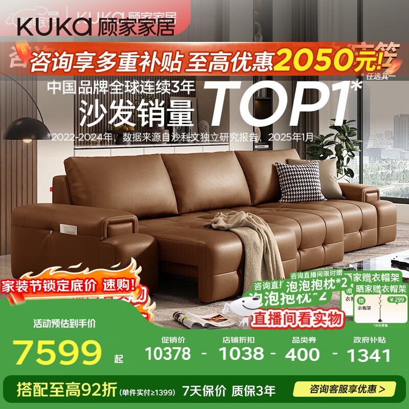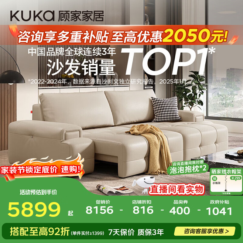 顾家家居(KUKA)劳伦斯电动沙发床客厅6330 基础版-卡其色-柔韧肌理皮 2.5M双电动