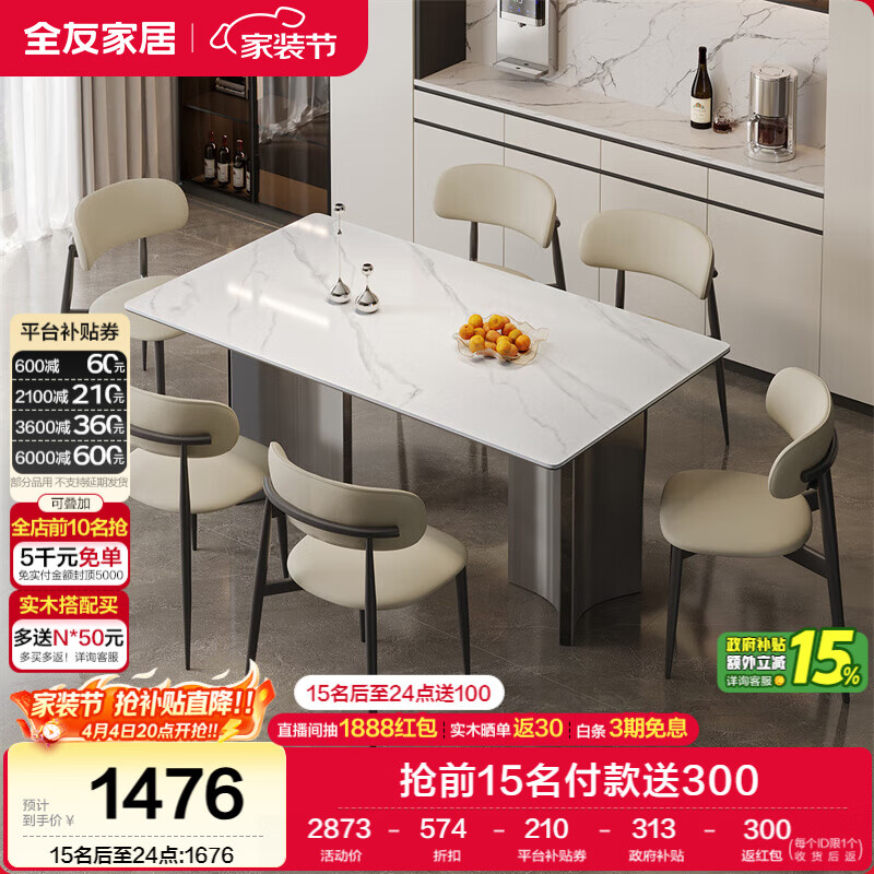 全友家居 岩板餐桌意式轻奢高级感客厅家用吃饭桌子4-6人一桌六椅套装