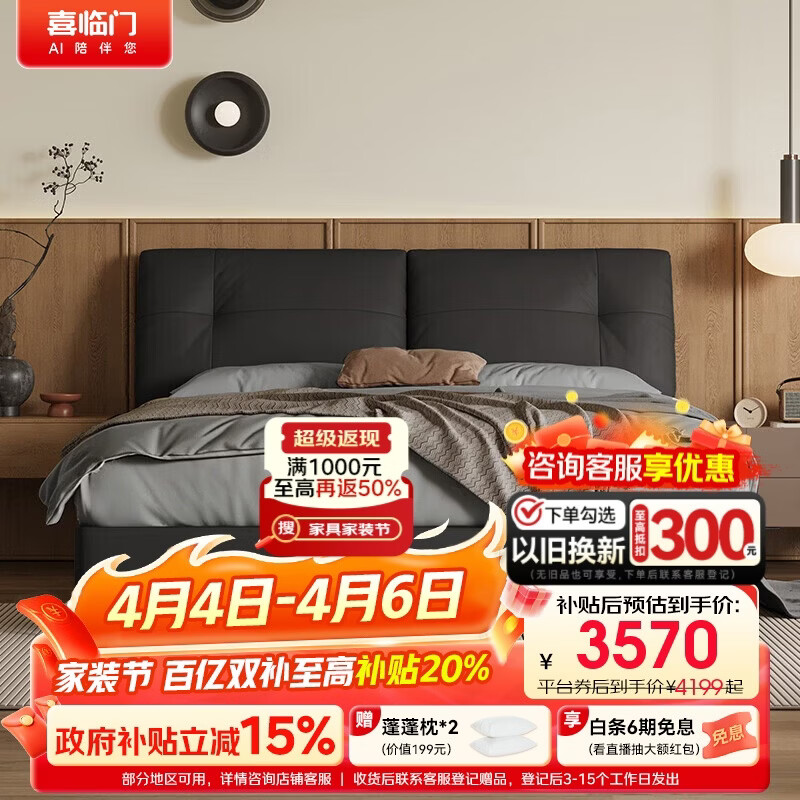 喜临门缓缓pro皮床+白骑士plus床垫套餐 双人舒适大床极光黑软床1.8x2米