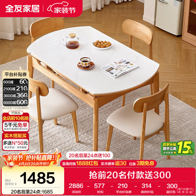 全友家居 现代北欧风岩板餐桌椅子全套客厅家用多功能可伸缩吃饭桌子