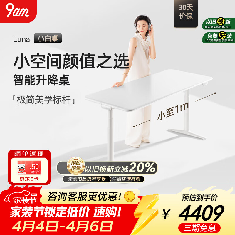 9am智能电动升降桌Luna小白桌 站立式电脑桌学习桌 喷粉板白色 1.4m