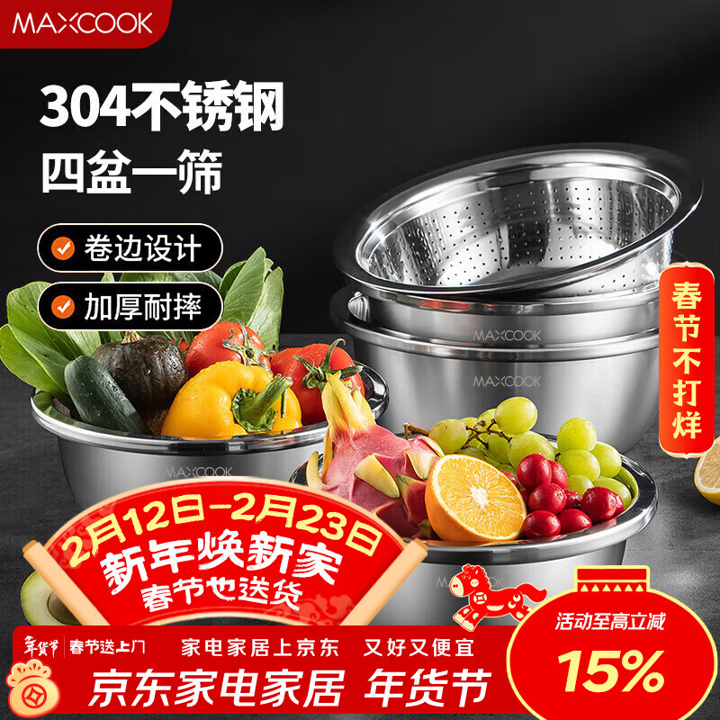 美厨(MAXCOOK)304不锈钢盆筛五件套加厚沙拉盆调料盆洗菜盆米筛味斗套装MCWA550