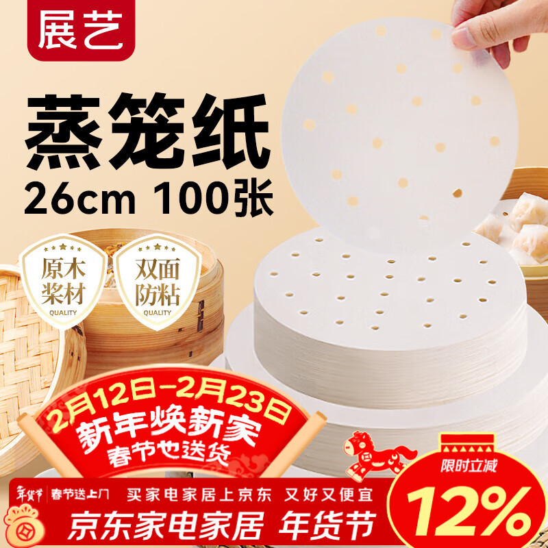 展艺蒸笼纸26cm*100张一次性食品级圆形包子馒头新年面点蒸屉不沾垫纸