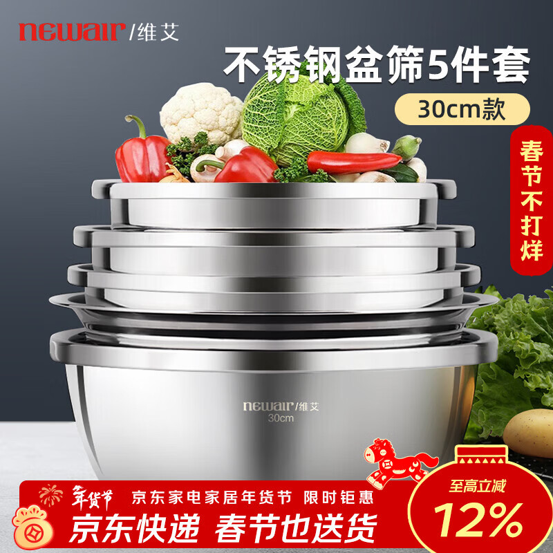 维艾(Newair)不锈钢盆五件套调料盆淘米洗菜盆和面盆沥水篮沙拉盆米筛味斗套装